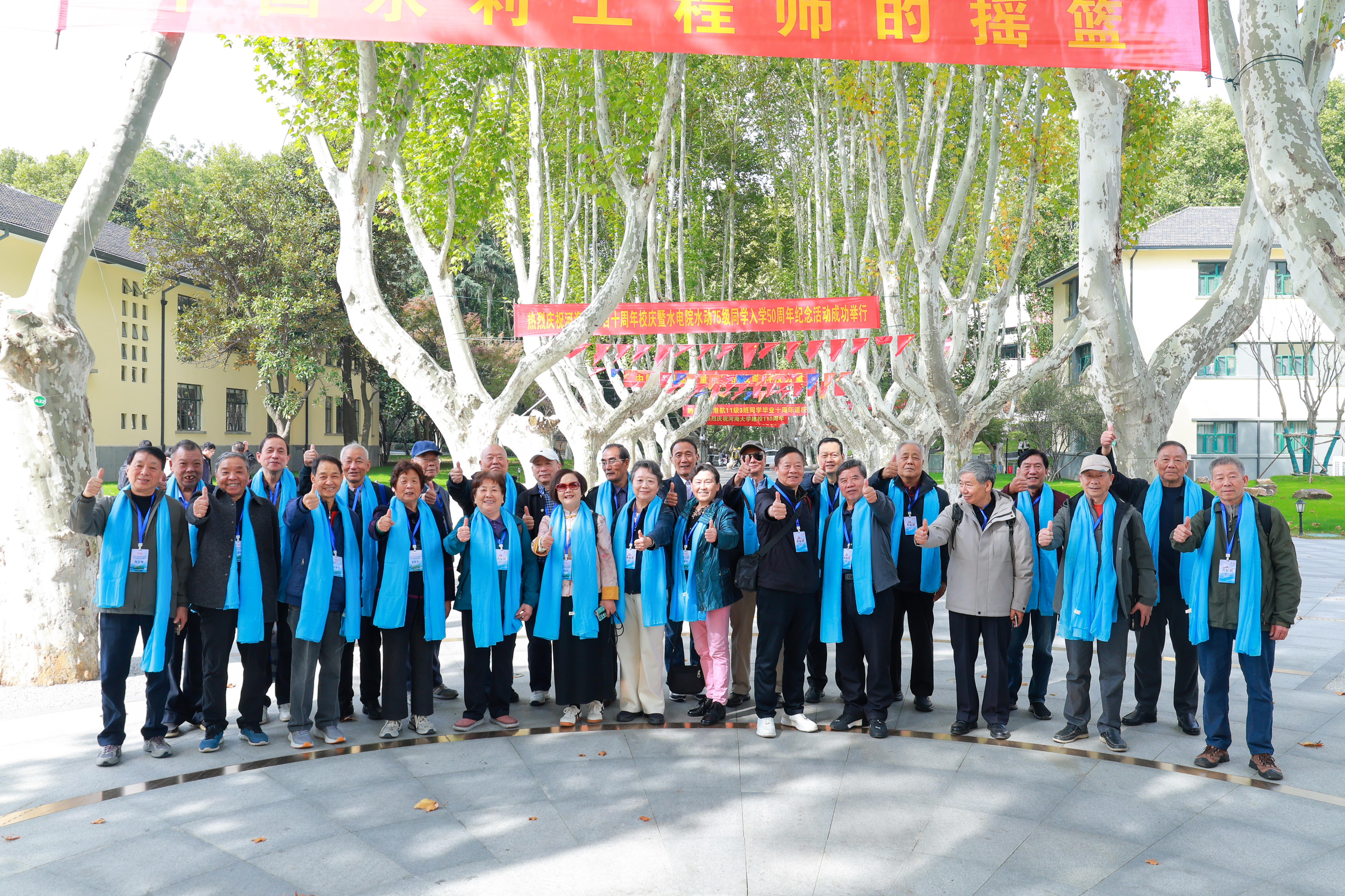 11月4日上午,75级校友们聚在河海大学西康路1号门前,他们人人佩戴一条“河海蓝”围巾,与母校合影留念。校友们在熟悉的校园里徜徉,回忆着学生时代的一点一滴,追随着记忆,流连在水电学院门前。在那个矗立着的、硕大水轮机转轮前,同学们动情地抚摸着它,深情回忆着老师当年上课的模样,也讲述着毕业后各自在水利行业工作的往事,他们中有水利局长、总工、技术总监、教授,有的退休多年仍被返聘,巡察巡检,传帮带,“毋负邦人期”。校友们盛情邀请水电学院两位年轻的当家人合影,畅叙,祝愿水电学院再创辉煌。