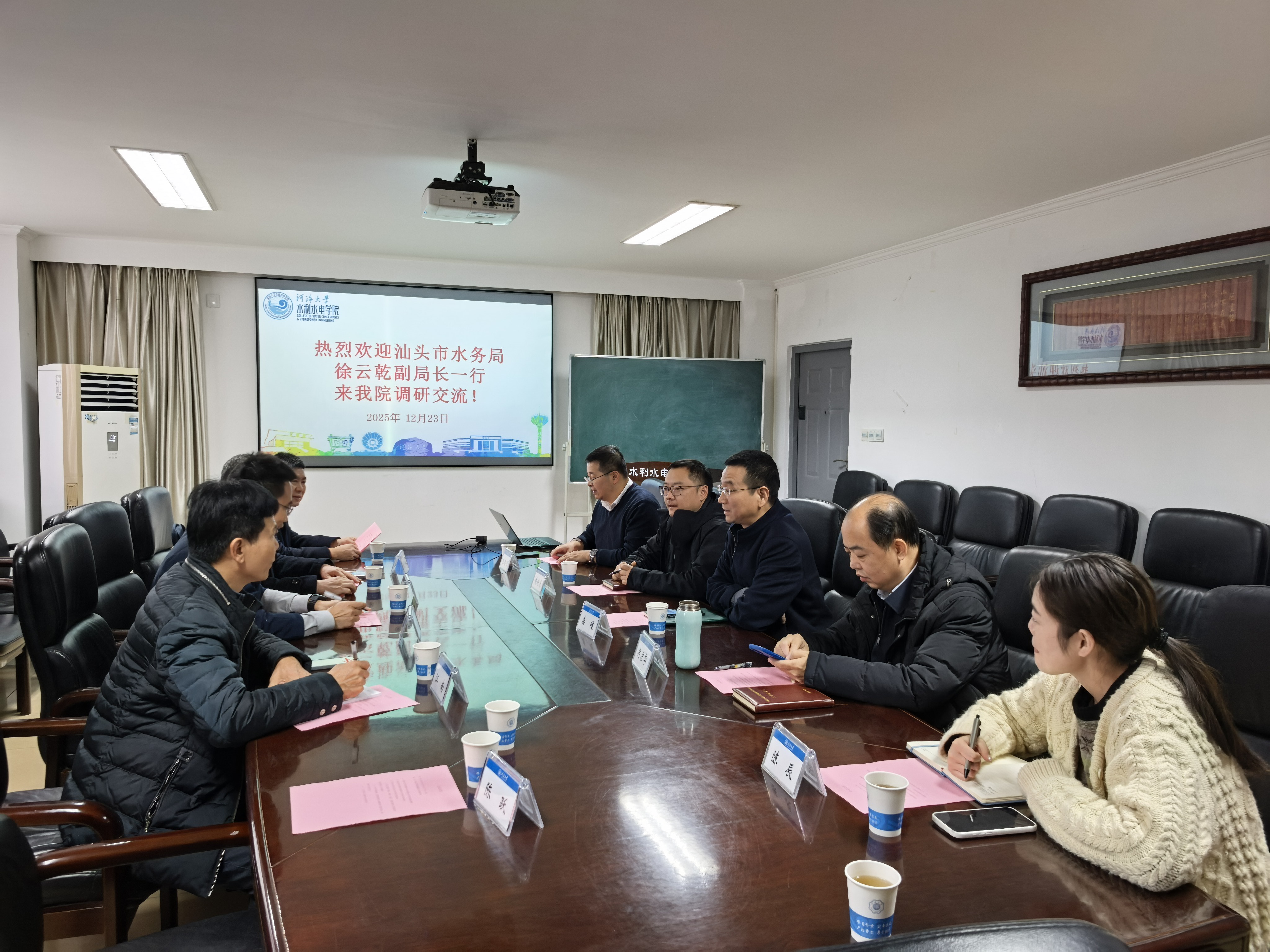 12月23日下午,汕头市水务局党组成员、副局长徐云乾一行到访博彩网-信用网博彩 ,就深化校地合作开展交流座谈。汕头市水务局二级调研员韩映民、三级调研员江南、市水利学会理事长张介炳、水旱灾害防御科副科长陈跃,博彩网 党委书记娄健、副院长冉启华、俞晓东,教授包腾飞,辅导员陈辰等参加座谈。
