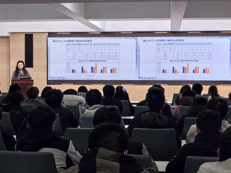 会上,帅雨婷围绕年级学业整体情况开展全面复盘与深度分析,以数据图表直观呈现成绩分布、优秀学子风采、专业成绩差异及课程重难点,系统梳理学风建设成效。她充分肯定全体同学在基础课程学习中付出的努力与取得的成果,客观指出部分同学在核心重难点科目中存在的薄弱环节,结合历年数据纵向研判大三下学期学业关键挑战。她强调,大三是学业发展的重要分水岭,更是综合能力提升的黄金窗口期,勉励全体同学正视差距、补齐短板、夯实根基,以扎实学风筑牢成长基石。