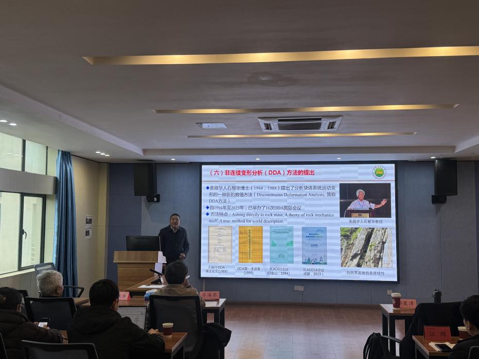 长江科学院邬爱清正高级工程师作题为“裂隙岩体非连续变形分析方法及工程应用”的主题报告,介绍了DDA自20世纪90年代以来的理论成果、工程应用与研究体会,阐述了DDA相对连续介质方法的本质特点与收敛原则,并通过一系列工程验证了其应用效果。