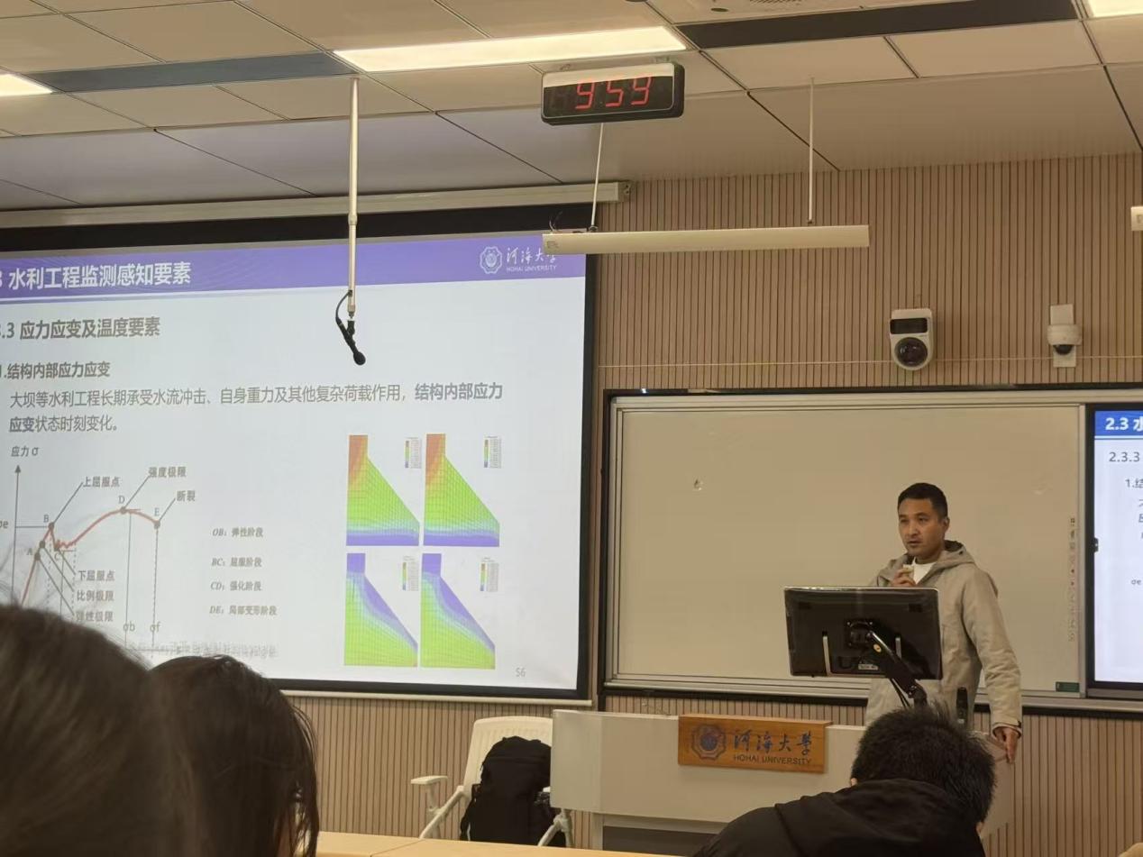 在渗流监测方面,詹教授重点讲解了绕坝渗流、地下水水位、渗漏流量、水质等监测内容,指出全方位监测可评价防渗效果、排查渗漏隐患,与安全工程专业方向高度契合。 针对应力应变及温度监测,他结合水工结构受力特点,介绍了监测对掌握结构健康、防范开裂失稳风险的重要作用,强调温度监测是控制混凝土应力、减少裂缝的关键。