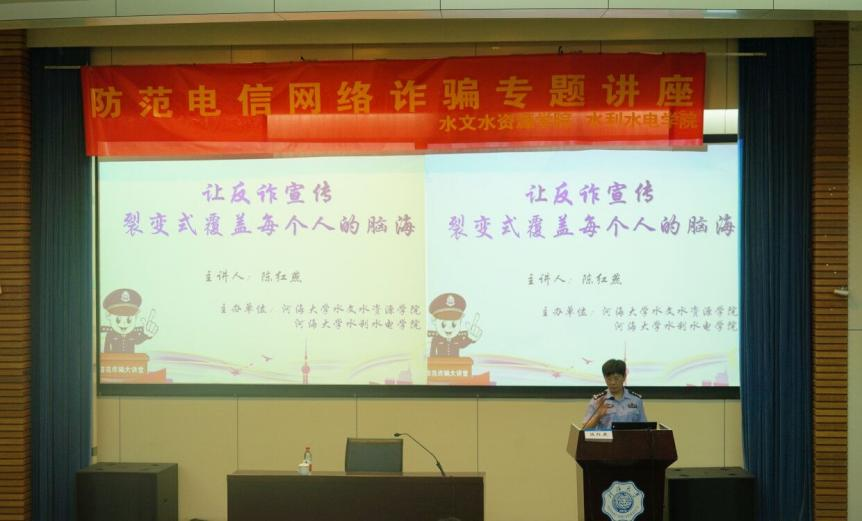 为了提高广大师生识别和防范电信诈骗的能力,使防范电信网络诈骗知识更好地入耳、入脑、入心,2021年5月13日晚,博彩网 与水文院联合南京市公安局刑侦局反诈中心,邀请四级高级警长陈红燕开展了大学生防范电信诈骗知识专题讲座。讲座由河海大学保卫处副处长吴青山主持,水电院2019级辅导员帅雨婷、水文院2019级辅导员许文傧出席,两院学生参加。